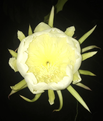 They bloom at night, this was the first one (on the full moon) and hand-pollinated since there aren’t many pollinators at night. Looks like it worked since the fruit is developing.