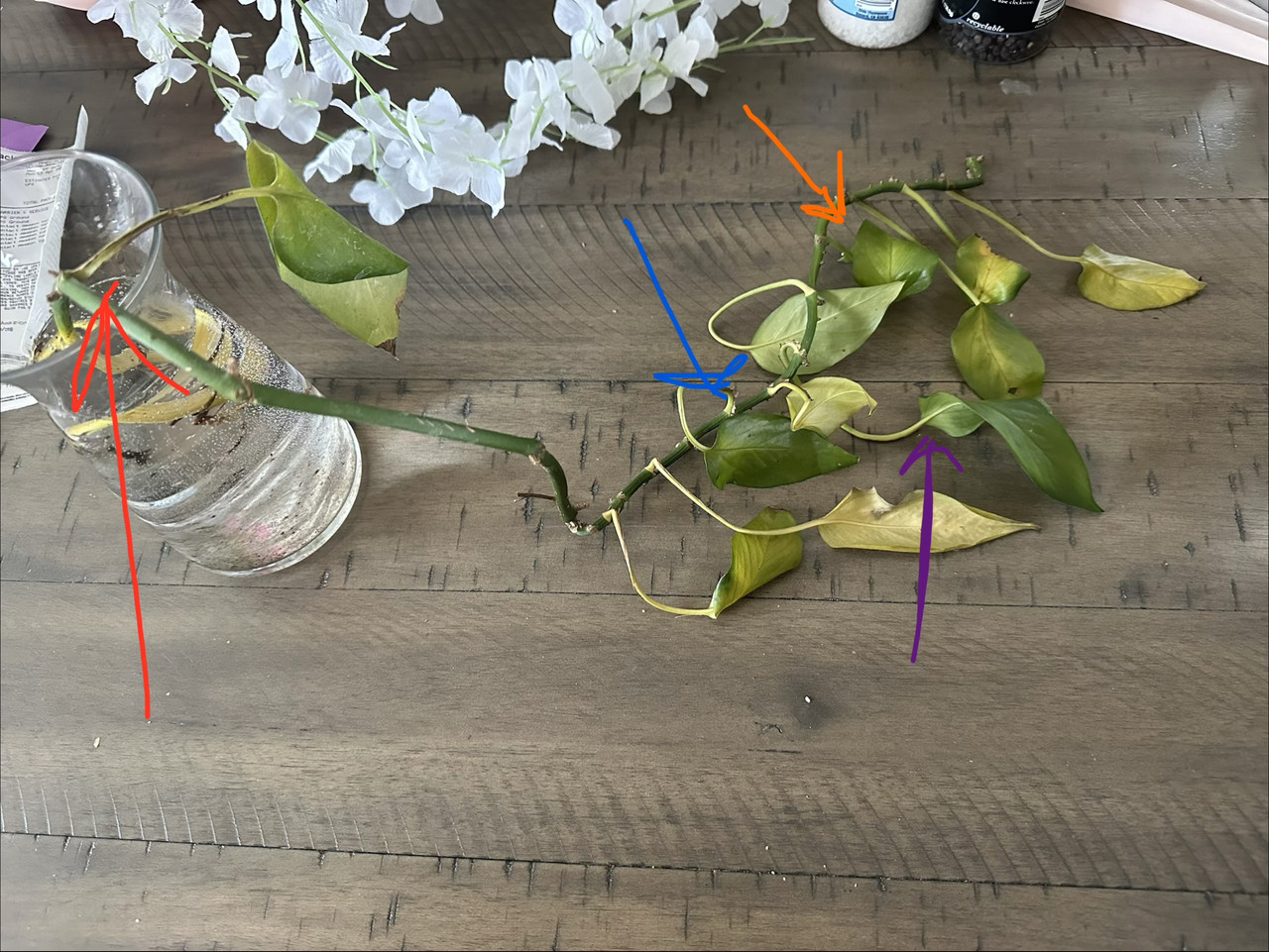 Okay so what would you consider a good leaf? I drew lines where I guessed might be good to cut above. The red on is big and not completely yellow, the blue and purple ones look good but are somewhat close together. The purple one has a root nodule opposite of the leaf/stem connection and one more below it, opposite of the bad leaf I would prune below it, so it would have two nodules, but would it just be better to put the purple and blue together one one cutting? The orange one also has one node opposite and one node below it.